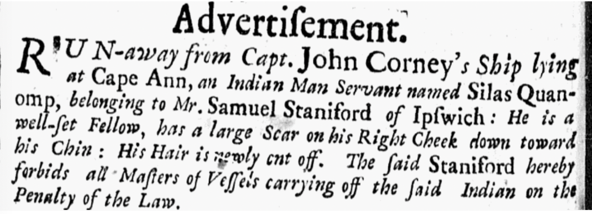 RUN-away from Capt. John Corney's Shop lying at Cape Ann, an Indian Man Servant named Silas Quanomp, belonging to Mr. Samuel Staniford of Ipswich: he is a well-set Fellow, has a large Scar on his Right Cheek down toward his Chin: His Hair is newly cut off. The said Stan…